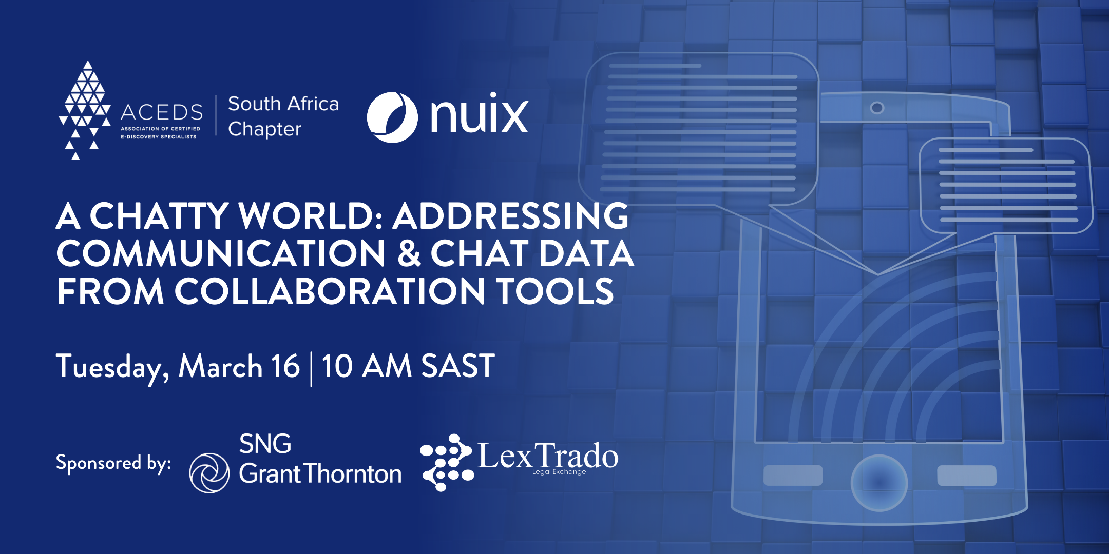 Join the ACEDS South Africa Chapter for a panel discussionJoin ACEDS South Africa, Nuix, SNG Grant Thornton and LexTrado in discussing how people, process and technology are addressing emerging data […]